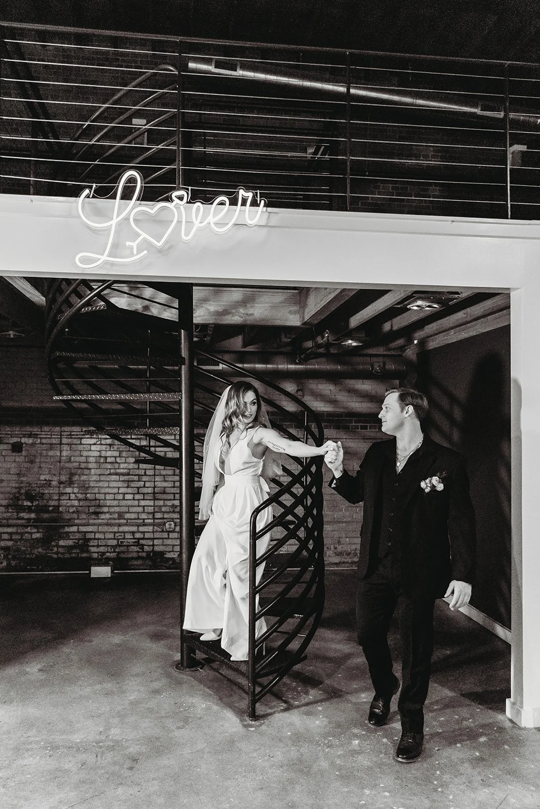The Iconic Spiral Staircase: Our primary mezzanine features a striking black spiral staircase—the ultimate spot for grand entrances or portraits.
